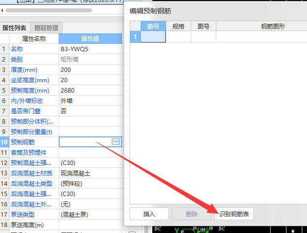 3、预制钢筋的处理。如果需要计算预制钢筋,可以在预制构件属性的【预制钢筋】属性中识别预制构件钢筋明细表。