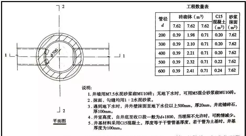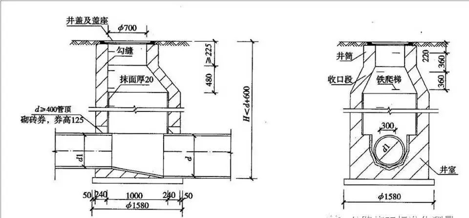 井室直径不小于1m,井筒直径不小于0.7m。井室与井筒间以渐缩部连接。也可在井室上加钢筋混凝土盖板,在盖板上砌筑井筒。