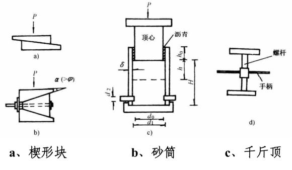 卸落设备用于将模板松动 、 下落一定距离 , 以便拆除模板 。满堂支架法中顶托即为卸落设备,梁式、梁柱式支架中常常在支墩顶部设置如下卸落设备。