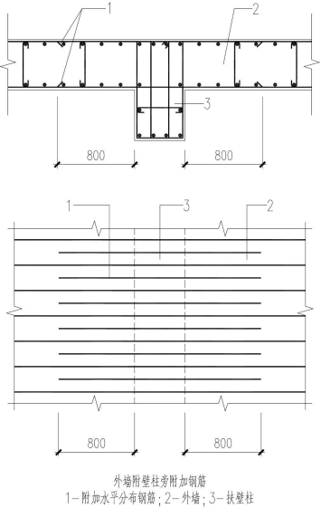 (4)为利于控制裂缝,地下室外墙将水平分布钢筋布置在竖向钢筋的外侧。当地下室外墙设有附壁柱时,应在附壁柱处沿竖向原有水平分布钢筋间距之间增加直径为 8mm、长度为柱每边伸出 800mm 的附加钢筋,做法如下图。