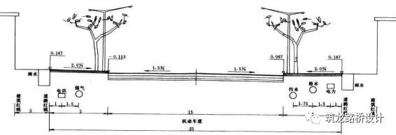路侧带是位于城市道路行车道两侧的人行道、种植带、公用设施带等的统称。一般高于行车道0.08~0.2m,横坡采用直线型,向内侧倾斜,坡度为1~2%。