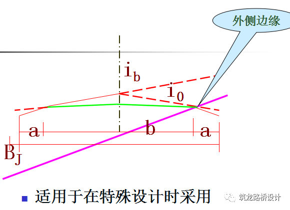 第二步,将外侧部分绕中轴(路中线)旋转,逐渐抬高外侧路面和路肩,达到单向的路拱坡度。所需要长度为x0
