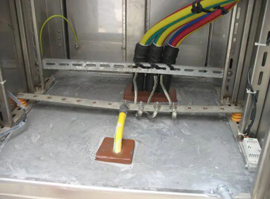 电缆在通过电气柜底部或贯穿电缆沟时,可采用防火泥封堵,为避免堵料对电缆绝缘层造成腐蚀,可加套塑料或橡胶管防护。