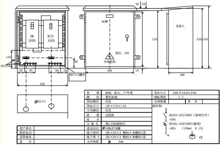 本文中配电箱(柜)适用于施工现场及户外临时用电,应满足“三级配电、二级漏保、一机一闸、一漏一箱”配电及保护的使用要求。配电箱(柜)、开关箱的材质选用、制作工艺、箱内电气元件的选择、配置应符合国家相关标准,产品应通过CCC认证。配电箱(柜)的壳体采用冷轧钢板制作,箱体设计为户外使用型,满足防雨、防尘要求,箱体钢板厚度符合JGJ46-2005标准要求(≥1.2mm)。