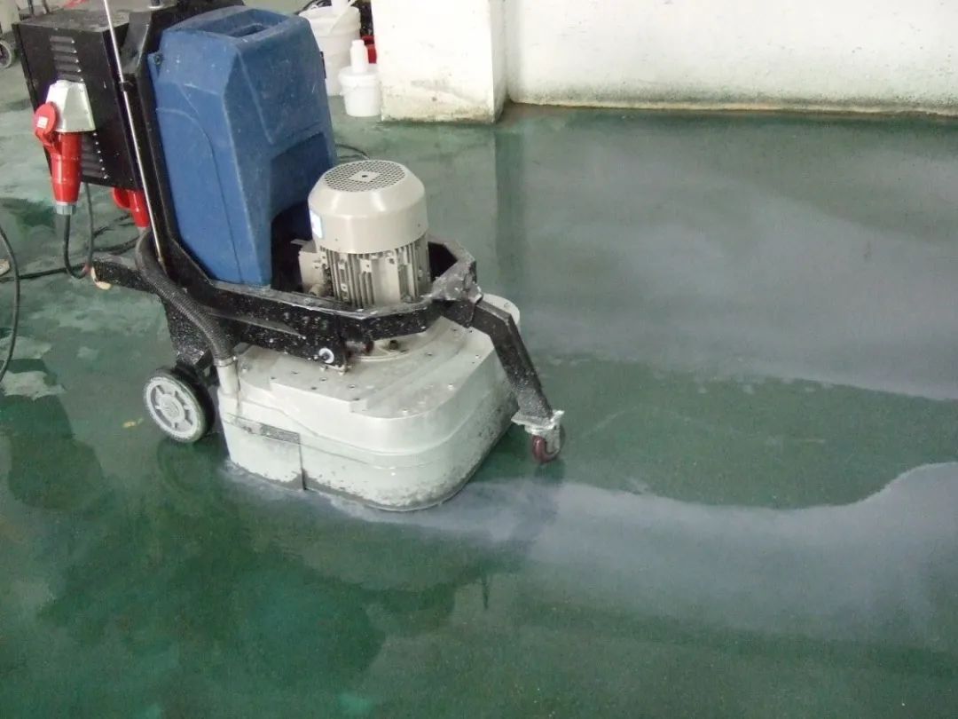 5)基层表面洒水,用300目树脂磨片打磨(要求井字形均匀研磨地面,机器推行速度以一秒一步为标准,磨掉地面残留的材料和细微划痕),打磨完毕后,用500目打磨,然后将污水用吸尘器吸干净,通风使其基层干燥;