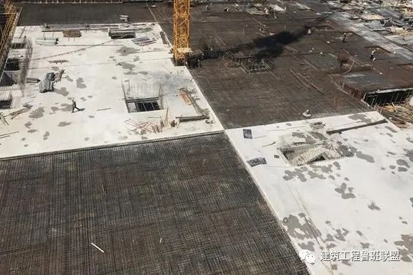 本工程跳仓施工范围负三层顶板以上。项目区块划分保留(e-d和T-U)轴后浇带,为解决钢筋混凝土收缩变形和减小温度应力等问题。