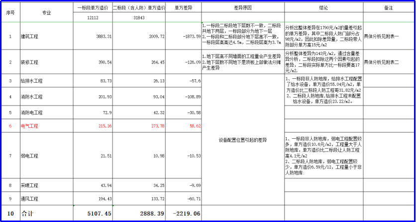 2、一标段非人防地库含配电室,含电气设备等,单方造价比无配电室的二标段人防工程高20.18元/m2.